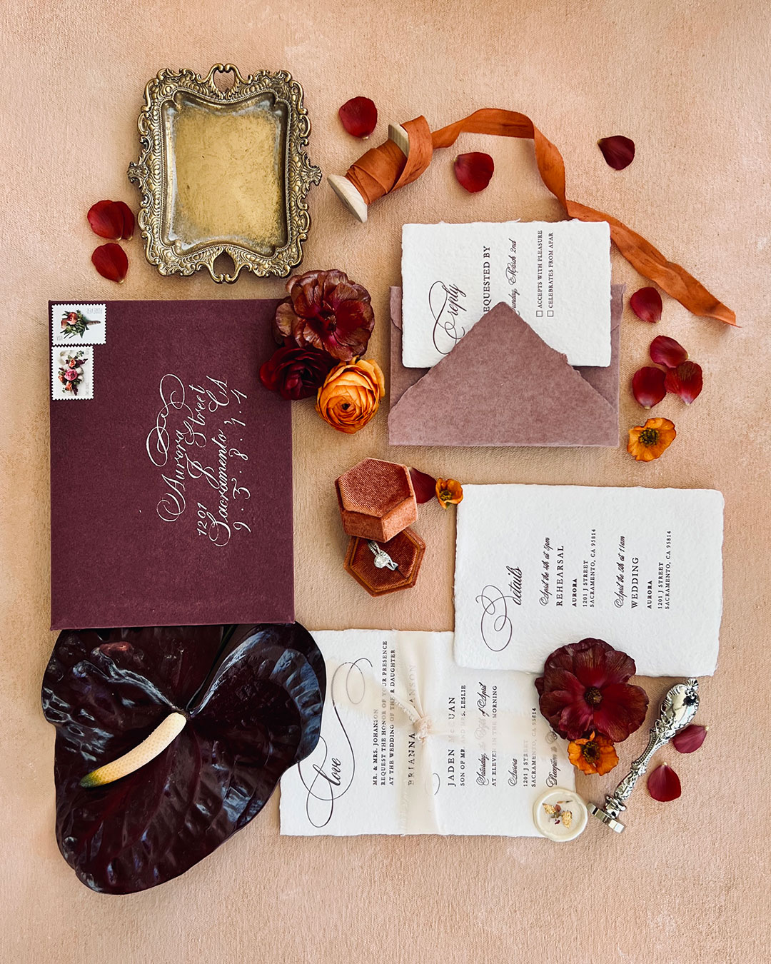 The Ember Wedding Suite is a sultry yet tender collection, thoughtfully designed for couples unafraid to make a romantic statement. Bold, asymmetrical compositions lend a contemporary edge, while sweeping flourishes invite the eye to linger on artful focal points. Every element is meticulously curated to captivate—creating an invitation as intimate and unforgettable as a whispered vow.